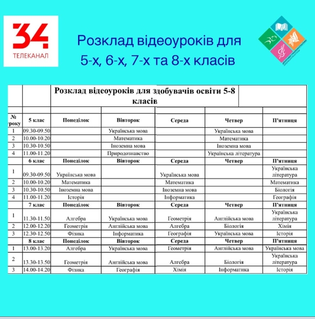 Відеоуроки для 5-х, 6-х, 7-х та 8–х класів розпочнуться у п’ятницю, 25 березня 2020р. на YouTube каналі 34 каналу за посиланням https://bit.ly/2y3uhsl