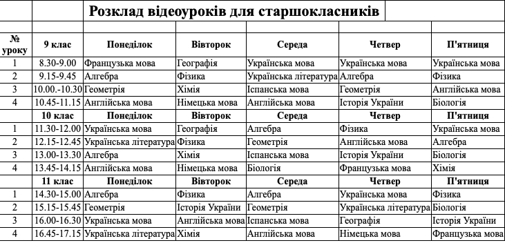 Розклад відеоуроків для старшокласників розміщено на офіційній вебсторінці департаменту https://bit.ly/3d9mCsP