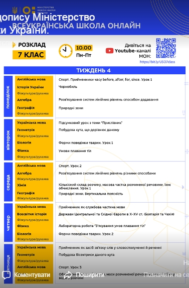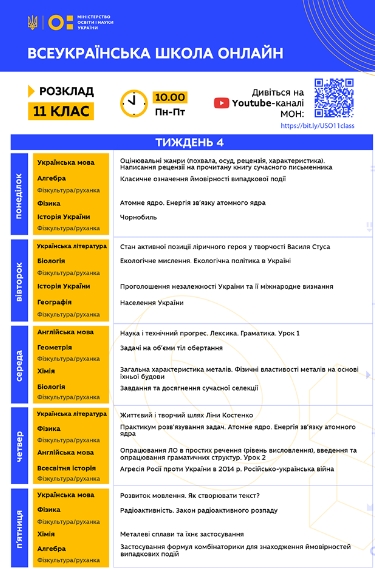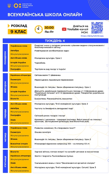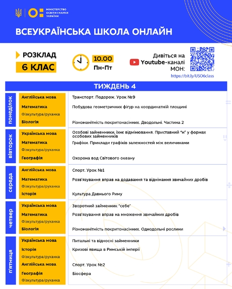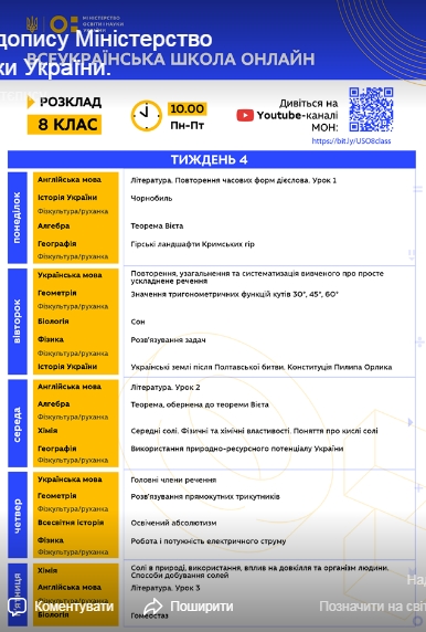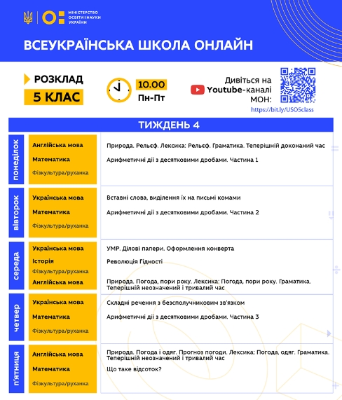 Адже вже о 10:00 стартує 4 тиждень Всеукраїнської школи онлайн. Усі уроки на сьогодні вже заплановано на YouTube МОН: